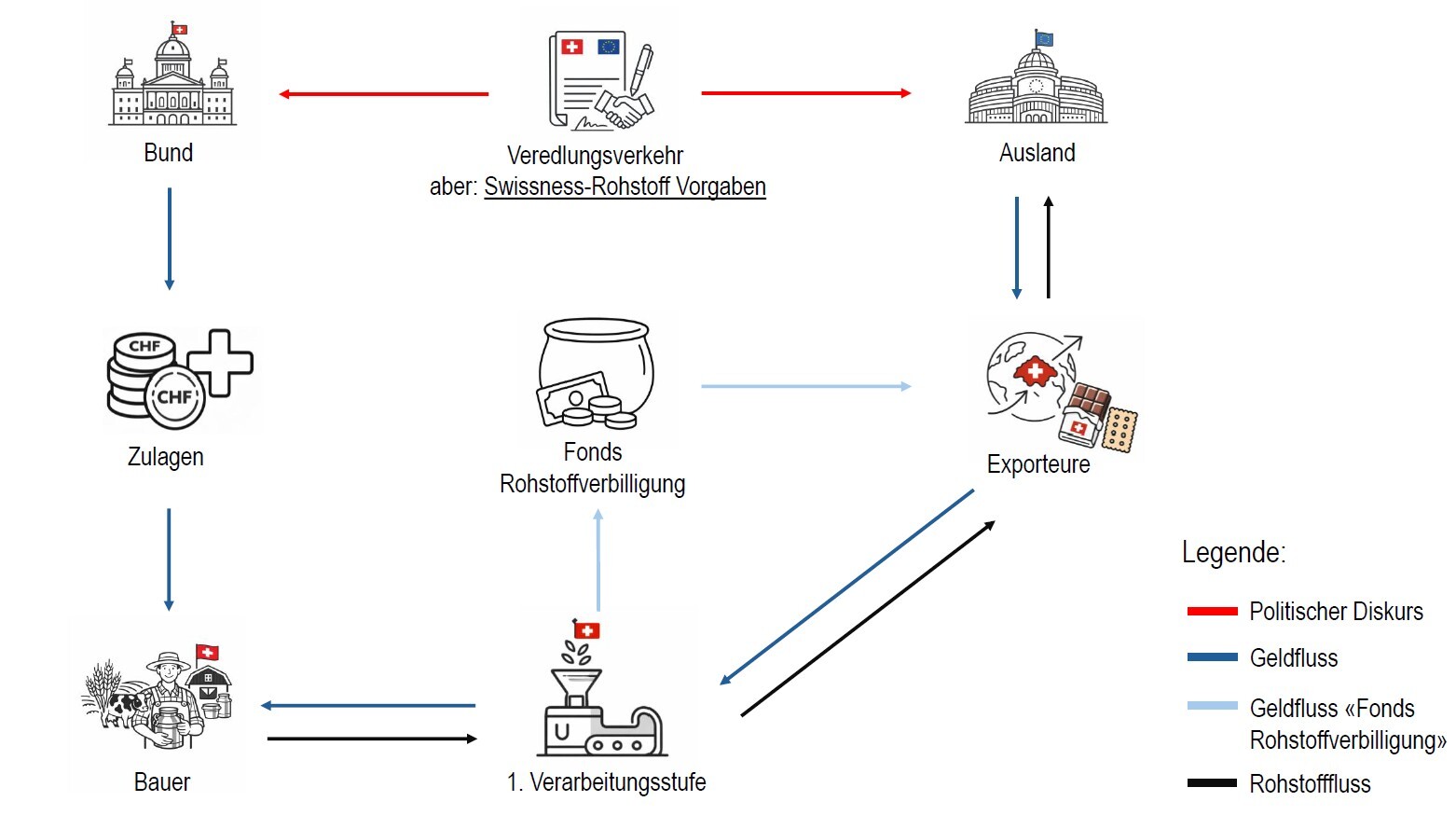Die früher an die Exporteure ausbezahlten Ausfuhrbeiträge werden seit 2019 als Zulage für Verkehrsmilch und als flächenbezogene Getreidezulage an die Landwirtschaft ausbezahlt. Damit die Wettbewerbsfähigkeit der exportierenden Lebensmittelhersteller aufrechterhalten werden kann, wurden privatrechtliche Ausgleichsmechanismen innerhalb der Agrar- und Lebensmittelbranche definiert, welche den Preisunterschied zwischen der Schweiz und dem Ausland ausgleichen sollen. - Vereinfachung des Bewilligungsverfahrens der aktiven Veredelung für die Exporteure: Ersatz des Konsultations- durch ein Informationsverfahren